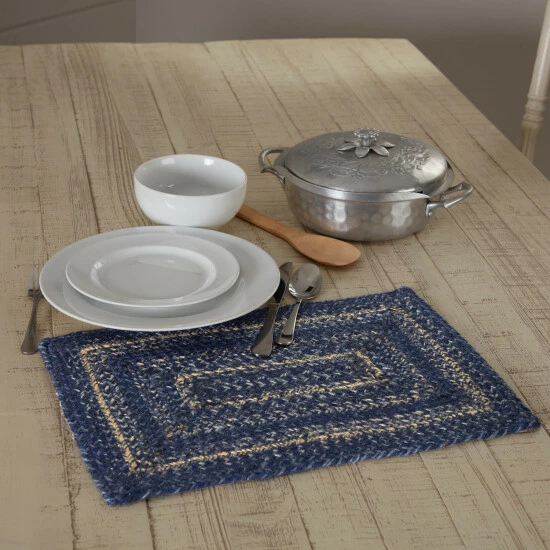 Add that cozy, farmhouse feel to your tabletop with our Great Falls Blue Jute Rectangle Placemat. This 12×18 inch rustic table placemat is the perfect feature for your kitchen or dining room table. The homemade feel comes to life with the woven braided jute wool blend fabrics in indigo, creme, and powder blue displayed in concentric rectangles. It’s perfect for any time of the year and can also be used as the foundation for a magical display in any room where you want that rustic farmhouse feel. It pairs perfectly with the Great Falls Blue Jute Coasters, Trivets, Chair Pads, and Runners.