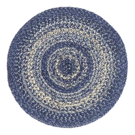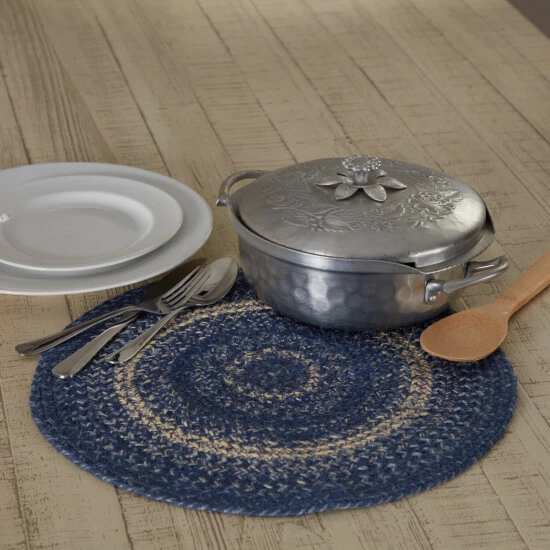 Protect your furniture in farmhouse style with our Great Falls Blue Jute Round Trivet. This 15 inch rustic table trivet is the perfect feature to stop heat from hot pots and pans from destroying a valued table or countertop. The homemade feel comes to life with the woven braided jute wool blend fabrics in indigo, creme, and powder blue displayed in concentric circles. This trivet is perfect for any time of the year and can also be used as the foundation for a down-home display in any room where you want that burlap farmhouse feel. It pairs perfectly with the Great Falls Blue Jute Placemats, Table Runners, and Chair Pads.