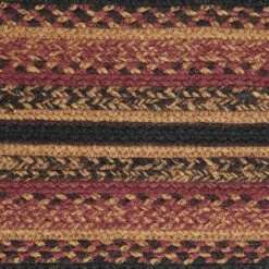 The Heritage Farms Jute 8.5×27 inch Oval Stair Tread brings a primitive look to your staircase in hues of mustard yellow, black, and burgundy. Latex spray on the reverse helps prevent some slippage, but we recommend using an anti-skid pad for safety.