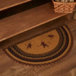 Adorn the front of your stairs with rustic warmth and primitive charm. The Heritage Farms 16.5″x33″ Star and Pip Half Circle Jute Rug presents primitive stars among pip berry garland on natural jute. Finished with raven black, burgundy, and mustard tan braided jute along the edge working its way into the center surrounding the decorative stenciling to create a beautiful lasting impression. This classic country jute rug will fit nicely at the foot of your stairs, in front of your entryway door, or placed in front of your kitchen sink to prevent slippage when washing dishes. Includes a separate 100% PVC rug pad that works on most floor types for non-slip quality.