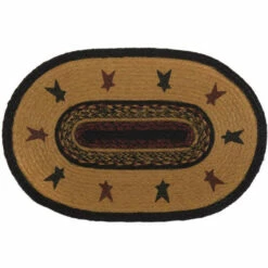 The Heritage Farms Star Jute Placemat Oval Set lifts its colors from the bedding set to complete a quietly primitive look throughout the entire house. A ring of star stenciling on jute adds a homey flair to this placemat.