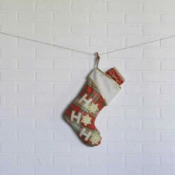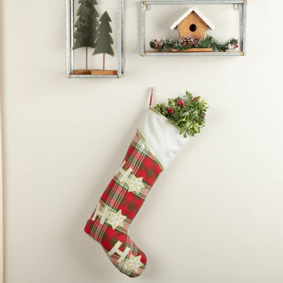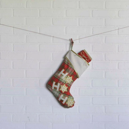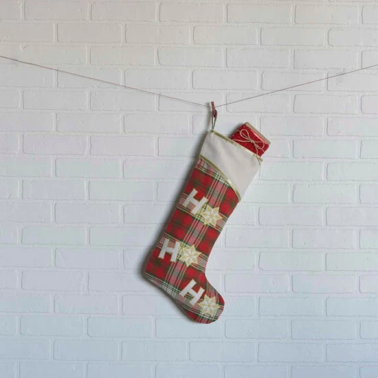 - Cherry red, creme, and forest green plaid cotton fabric with appliqued “HO HO HO” in creme felt with gold rope detail
