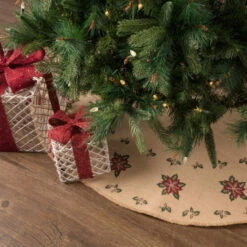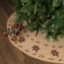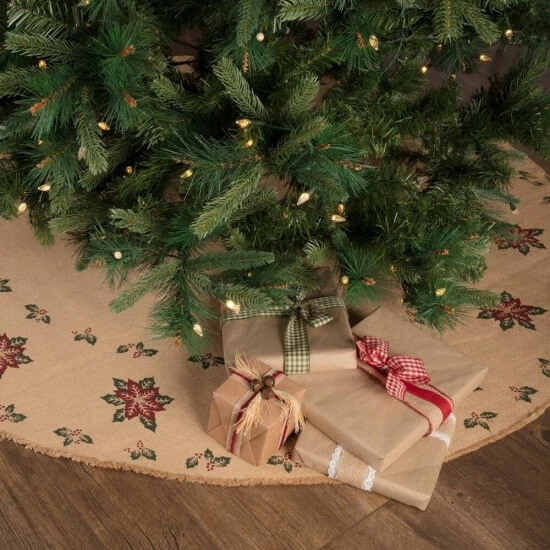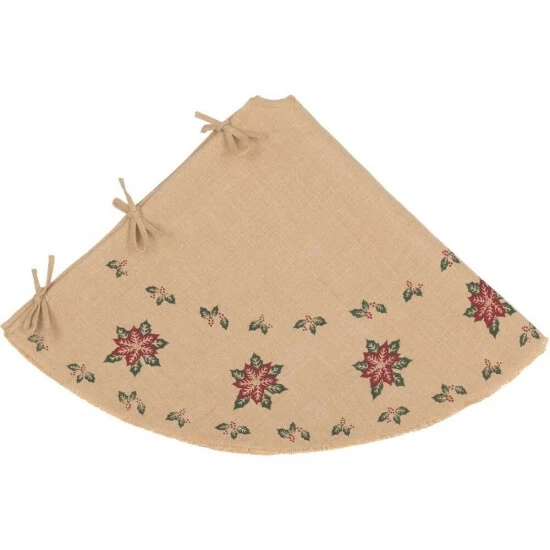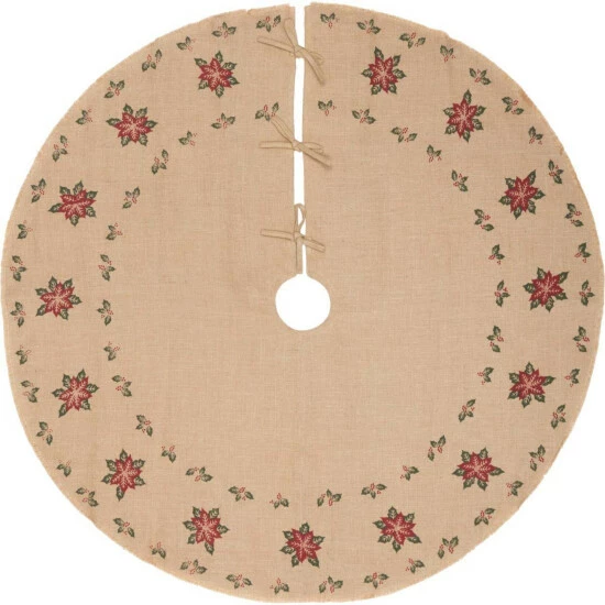 - Alternating rows of holly berries and poinsettias stenciled in red and green around outside edge