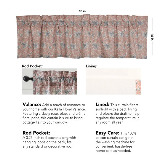 Bring your romantic fairytale cottage vision to life with our Kaila Floral Valance 16×72. This dusty rose, navy, and creme curtain set is beautifully decorated with a bold floral print that adds rustic romance and heartwarming, cozy cottage vibes to your window.