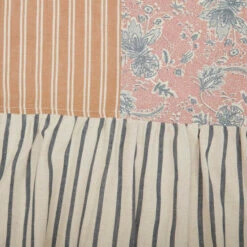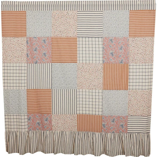 Effortlessly transform your bath with the classic rustic romance of our Kaila Patchwork Shower Curtain 72×72. Classic stripes, vintage florals, and windowpane pattern patchwork in navy, gold, and dusty rose grace this decorative curtain along with a delicate ruffle at the bottom. Easily hang this country cottage bath curtain with shower hooks of your choosing (not included) using the button holes attached. A 3″ rod pocket is also available as an alternative hanging method.