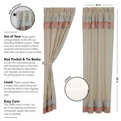 Bring the quiet and quaint fairytale cottage vision to life with our Kaila Blue Ruffled Panel Set of 2 84×40. This navy and creme stripe curtain set is beautifully decorated with graceful floral print ruffles towards the top that add rustic romance and heartwarming, cozy cottage vibes to your window. Includes two matching tie-backs for a quick style change.