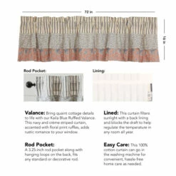 Bring the quiet and quaint fairytale cottage vision to life with our Kaila Blue Ruffled Valance 16×72. This navy and creme stripe curtain is beautifully decorated with graceful floral print ruffles towards the top that add rustic romance and heartwarming, cozy cottage vibes to your window.
