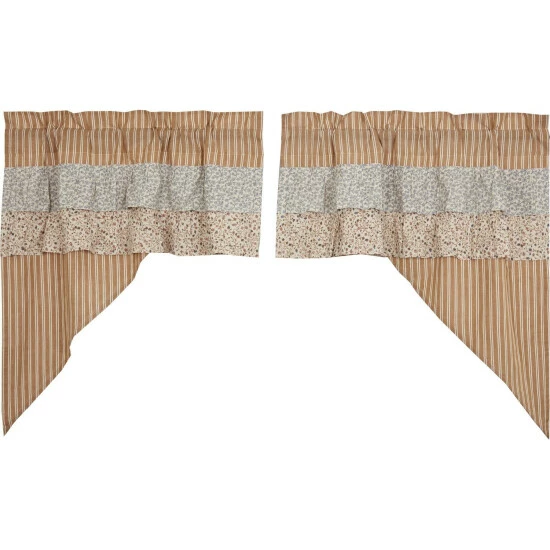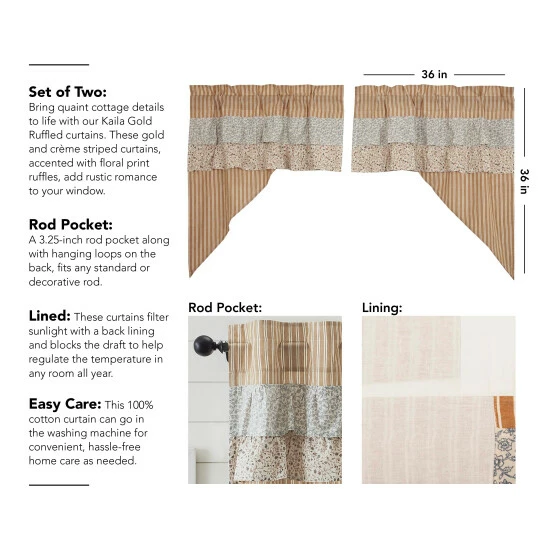 Bring the quiet and quaint fairytale cottage vision to life with our Kaila Gold Ticking Ruffled Swag Set 36x36x16. This gold and creme stripe curtain set is beautifully decorated with graceful floral print ruffles towards the top that add rustic romance and heartwarming, cozy cottage vibes to your window.