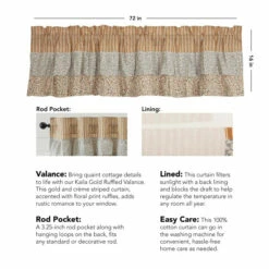 Bring the quiet and quaint fairytale cottage vision to life with our Kaila Gold Ticking Ruffled Valance 16×72. This gold and creme stripe curtain is beautifully decorated with graceful floral print ruffles towards the top that add rustic romance and heartwarming, cozy cottage vibes to your window.