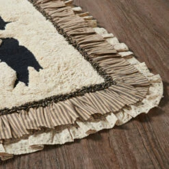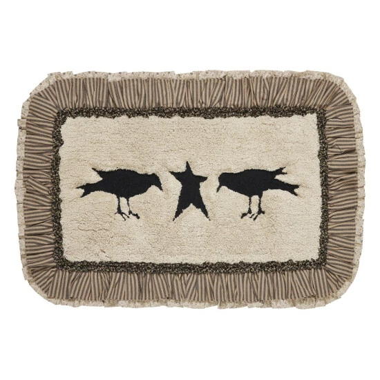 Add a primitive flair to your bath or living space with the Kettle Grove Bath Mat. This beautiful dark creme, grey, and black 20×30 mat coordinates with country-themed decor. With a ruffled edge, ruched ruffle, tufted weave, and embroidered crow and stars, this bath mat will find a place in your home for years to come. Reverses to a solid tan rubber underside to prevent slippage.