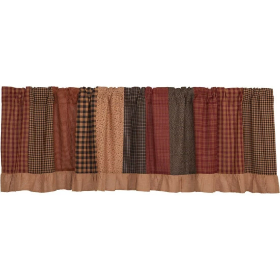 Our well-loved Maisie collection took old-fashioned warmth and comfort to the next level with our Maisie Patchwork Valance 19×72. This primitive kitchen curtain is adorned with burgundy, natural, and country black patchwork, delicately trimmed with a cotton burlap ruffled edge and lined with white cotton for a quality finish.