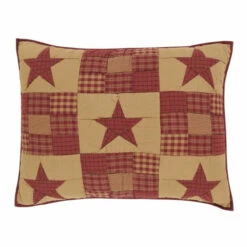 Β Relax in rustic, country style with this folksy sham. The Ninepatch Star King Sham features a 3×3 grid of alternating plaid stars and nine patch blocks. Nine patch patterns add historical charm to these 21″ by 37″ shams. Looks great in homes with primitive or Americana decor. Reverses to solid burgundy with three boutique tie closures. 100% cotton.Β