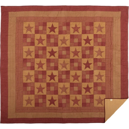 The Ninepatch Star Quilt Set takes its name from the historical nine patch quilt pattern. This simple pioneer pattern alternates various hued multi-fabric blocks with large five-point stars. The combination of the nine patch and barn stars brings relaxed, folksy charm to your bedroom. Featuring hand-quilting with stitch in the ditch and echo techniques adding homespun, warmth to your home, our quilt set includes a comfy quilt and 1 patchwork sham. Use this 100% cotton quilt with primitive, Americana, or traditional country decor.