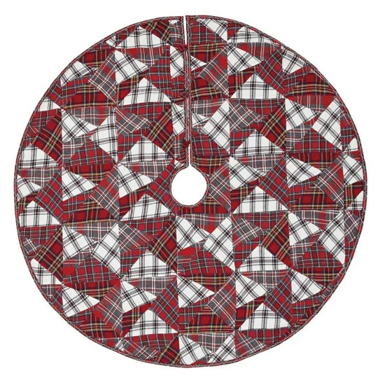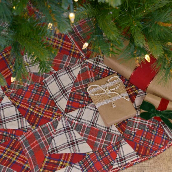 - Opening and outside edge trimmed with .5″ plaid binding adorned with red and ivory braided rope