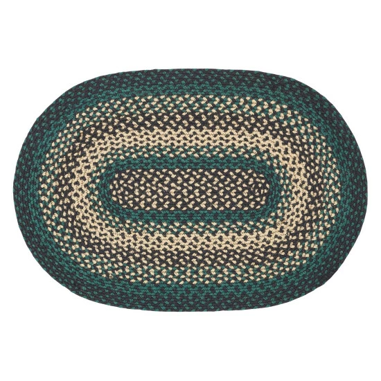 The Pine Grove Oval Jute Rug makes a textured addition to your rustic home decor; This 20×30 inch rug showcases beautiful concentric braids of black, tan, and green; Durable machine stitching holds the braiding together even with the increased wear and tear from constant use; Includes a separate 100% PVC rug pad that works on most floor types for non-slip quality.