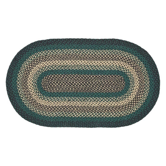 The Pine Grove Oval Jute Rug makes a textured addition to your rustic home decor; This 27×48 inch rug showcases beautiful concentric braids of black, tan, and green; Durable machine stitching holds the braiding together even with the increased wear and tear from constant use; Includes a separate 100% PVC rug pad that works on most floor types for non-slip quality.