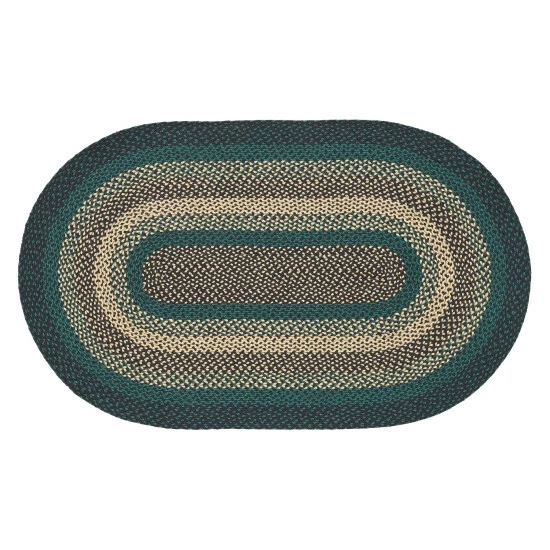 The Pine Grove Oval Jute Rug makes a textured addition to your rustic home decor; This 36×60 inch rug showcases beautiful concentric braids of black, tan, and green; Durable machine stitching holds the braiding together even with the increased wear and tear from constant use; Includes a separate 100% PVC rug pad that works on most floor types for non-slip quality.