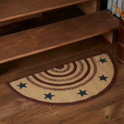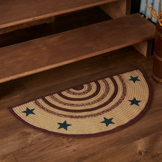 The Potomac Primitive Jute Rug with Stencil Stars warms a space with its natural texture and rich burgundy and tan shades that pair perfectly with any primitive, rustic, or Americana home decor. This 16.5×33 half circle rug lays beautifully with little to no wrinkles or curling edges due to our expertly woven, jute design. The shape of this cozy jute rug and primitive stenciled star design makes a lovely addition to your entryway, vignette groupings, or any area you want a soft spot for your feet. This rug includes a separate 100% PVC rug pad for non-slip quality.
