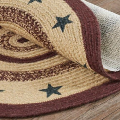 Enhance the look of your home with the 24×36 inch Potomac Jute Stencil Star Oval Rug. This rug beautifully features natural tan, burgundy, and navy braided jute blend fibers. Includes a separate 100 percent PVC rug pad to prevent slipping and moving.