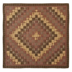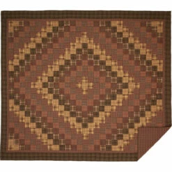- Patchwork blocks in “trip around the world” pattern russet, dark brown, tan, creme and green fabrics