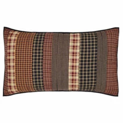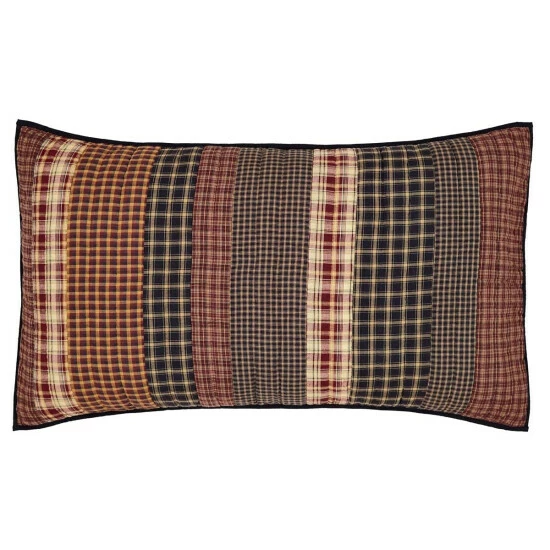 - Vertical strips of plaid fabrics in rust, creme, and black with gold accents