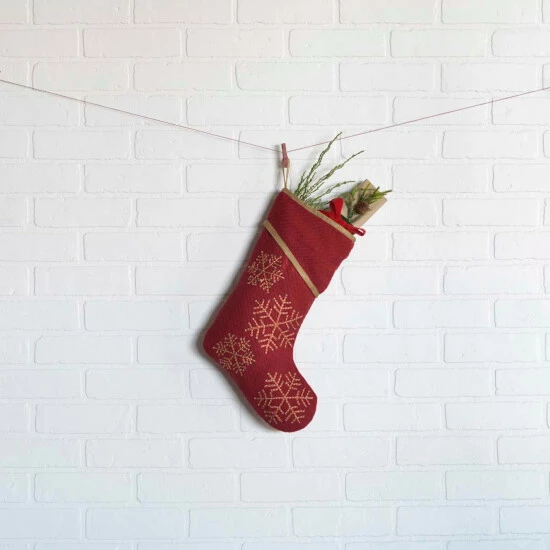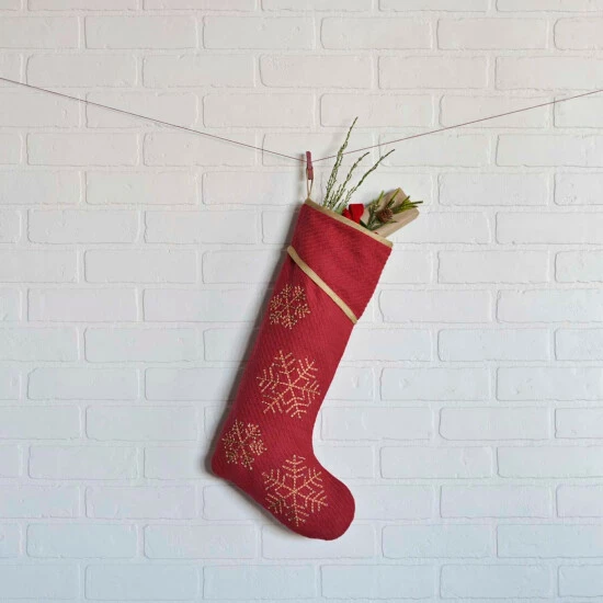 - Textured brick red woven fabric with shimmery embroidered snowflakes in red and gold braided rope
