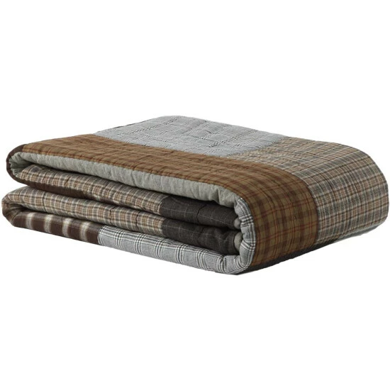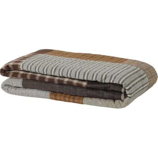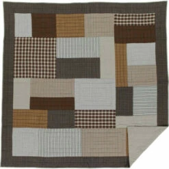 - Stitch in the ditch, echo, and channel hand-quilting on various greige, chocolate, and natural plaid and striped fabrics
