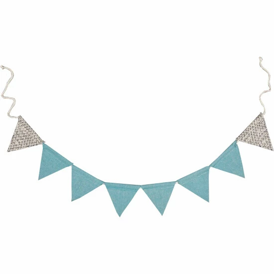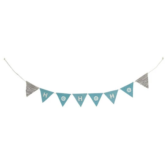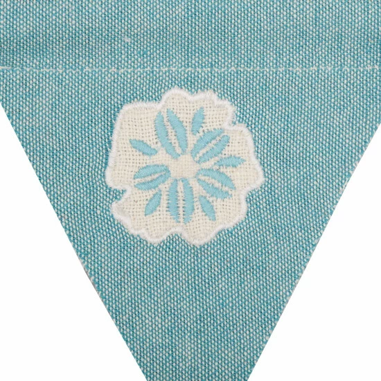 - Textured turquoise chambray fabric with repeating “HO”, “H” embroidered in shiny creme rope trim, “O” as cotton slub sand dollar applique with turquoise embroidery detail