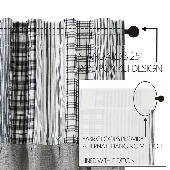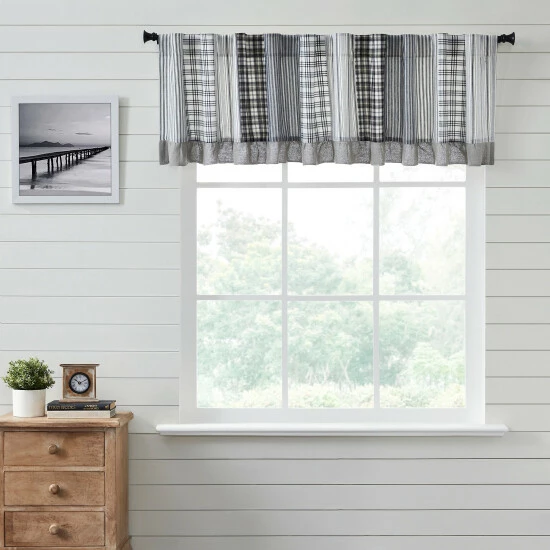 FARMHOUSE DECOR: Traditional handcrafted style that compliments any farmhouse or country home. Our ruffled patchwork valance features timeless black and soft white shades.