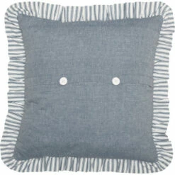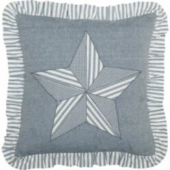 - FARMHOUSE DECOR: our Sawyer Mill blue rustic farmhouse pillow is perfect for your cozy entryway nook, living space, bedroom, or placed on an upholstered bench at the end of your bed. A ticking stripe ruffled edge and a denim blue backdrop with an old-fashioned barn star stenciled in a distressed soft white gives your space a soothing vintage feel with a touch of classic farmhouse style. Finish your home decor and mix and match a variety of our Sawyer Mill Blue pillows for a complete farmhouse look when decorating your cozy abode for any season.