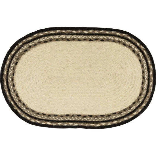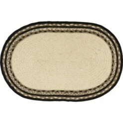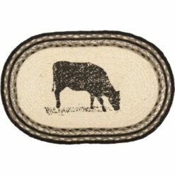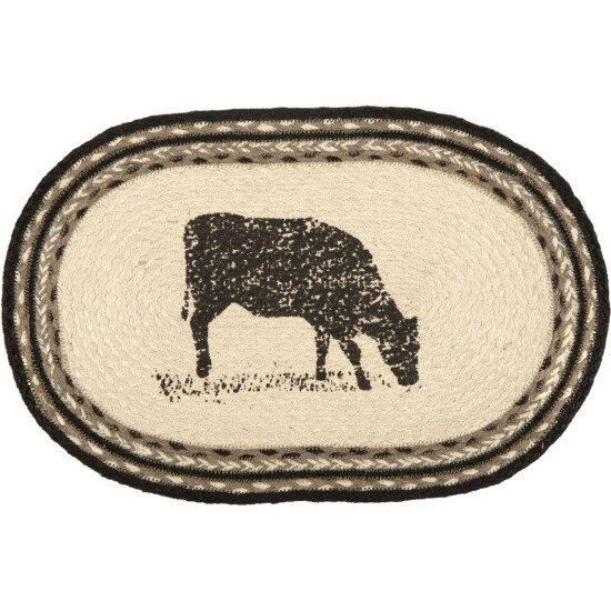 - FARMHOUSE COW: This placemat set contains bleached braided jute center accented with black, bleached, silver, and grey taupe braided border, grazing cow stenciled in center in distressed black