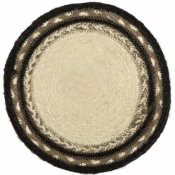 - FARMHOUSE COW: This trivet contains bleached braided jute center accented with black, bleached, silver, and grey taupe braided border, grazing cow stenciled in center in distressed black