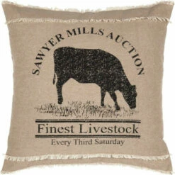 - FARMHOUSE HOME DECOR: This refreshing decorative pillow depicts a vintage-style cow with the words “Sawyer Mills Auction” and “Finest Livestock” stenciled on the front. With decorative fringe on the top and bottom giving this cushion a rustic vibe, our barnyard throw pillow makes a beautiful statement on your couch, sofa, or bed.