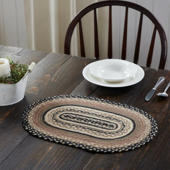 FARMHOUSE DECOR PLACEMAT: Includes 1 placemat (12×18); This farmhouse placemat makes a charming gift for any occasion; With over two decades of experience crafting goods for American homes, our items are built to last for years to come; Our Sawyer Mill Charcoal Creme farmhouse placemat is constructed with 80 percent jute and 20 percent other materials for a country decor dining room accessory.,JUTE MATERIAL: The jute placemat is crafted with 80 percent jute and 20 percent other materials, adding both style and function to your farmhouse decor; The beautiful design adds a small farmhouse decor flair to the placemat.,DETAILED DESIGN: The unique braided design of this placemat cannot help but bring farmhouse decor style to your home; The concentric colors only add to the overall quality of this farmhouse decor item.,COORDINATING ACCESSORIES: Pair our farmhouse placemat with matching coasters, kitchen rugs, chair pads, table runners, or trivets from the Sawyer Mill Charcoal collection.,EASY CARE: To give your jute placemat as many years of quality use as possible, carefully spot clean when dirty.