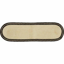 The oval Sawyer Mill Charcoal Pig Jute Stair Tread brings a Farmhouse look to your staircase. A farm pig is stenciled in distressed black on each end over beautiful solid ivory jute surrounded by concentric braids of black, grey taupe, silver, and ivory. Latex spray on reverse to prevent slippage.