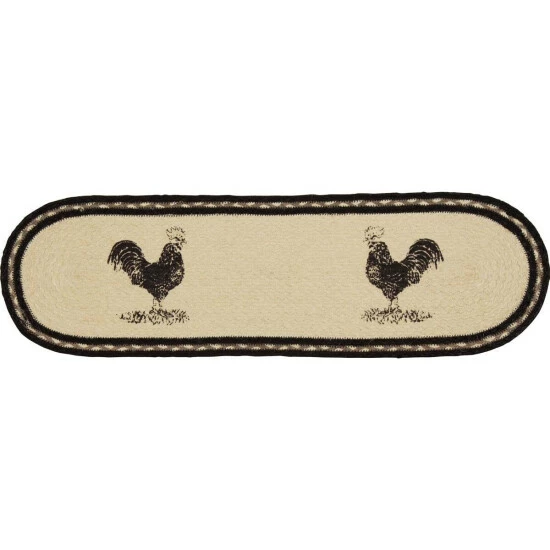 - FARMHOUSE ROOSTER: This stair tread contains bleached braided jute center accented with black, bleached, silver, and grey taupe braided border, rooster stenciled on each end in distressed black