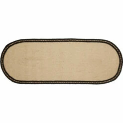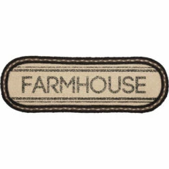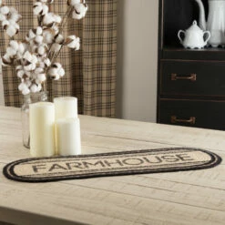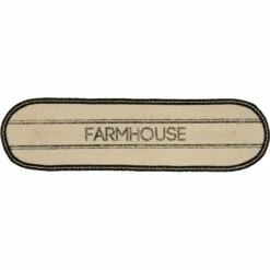 - FARMHOUSE: This braided table runner contains bleached jute center accented with black, bleached, silver, and grey taupe braided border, “Farmhouse” stenciled across center with grain sack stripes in distressed black