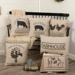 - FARMHOUSE ACCENT: This throw pillow contains the word “Farmhouse” stenciled in distressed black on khaki chambray base