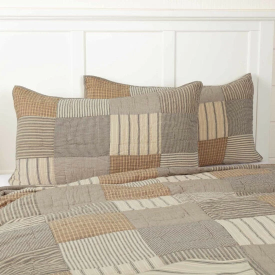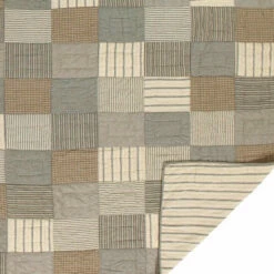 Sawyer Mill Charcoal Quilt Set with matching shams work perfectly to set the farmhouse mood in your bedroom. This farmhouse bed set contains stitch in the ditch and hand-quilting on neutrally colored fabrics with a simple brick layout in various plaid and striped Farmhouse fabrics creating a farmhouse rustic appeal. Both quilt and shams reverse to classically striped fabric.
