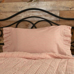 The Sawyer Mill Red Ticking Stripe Standard Pillow Case Set of 2 21×30 completes the look of your bed with a classic, vintage feel. Featuring country red and dark tan ticking stripes on beautifully textured cotton fabric, finished with a ruffle at the opening adding a touch of rustic romance. Coordinates well with the Sawyer Mill Red Ticking Stripe bedding.
