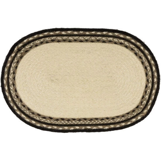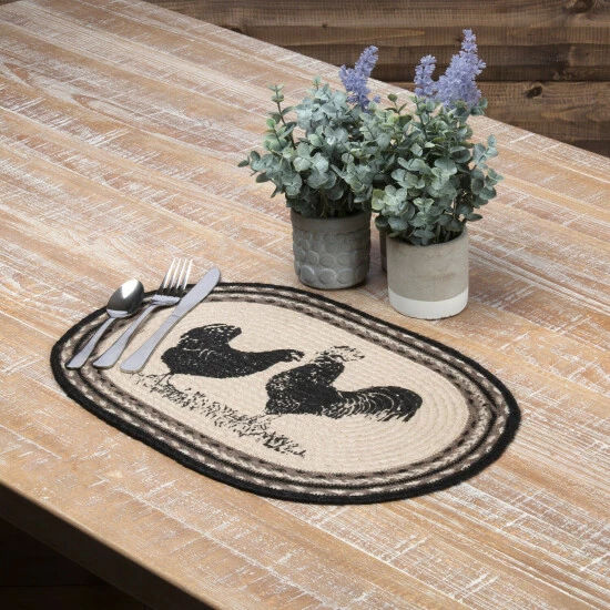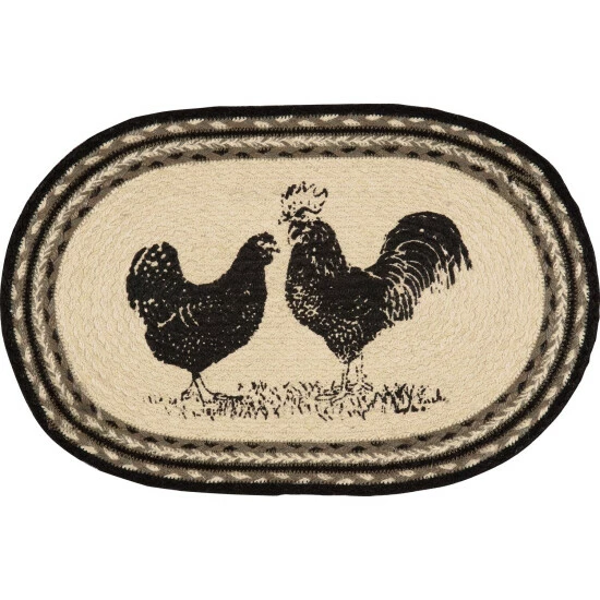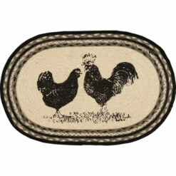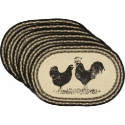 This sumptuous sextet–okay, that’s a little much, we admit–makes for an eye-catching, gorgeously rustic, literal farm-to-table addition to your space. A rooster and hen, both stenciled in distressed black over ivory, adorn the centerpiece of the mat, amidst concentric braids of black, greyish taupe, silvertone, and gleaming ivory.