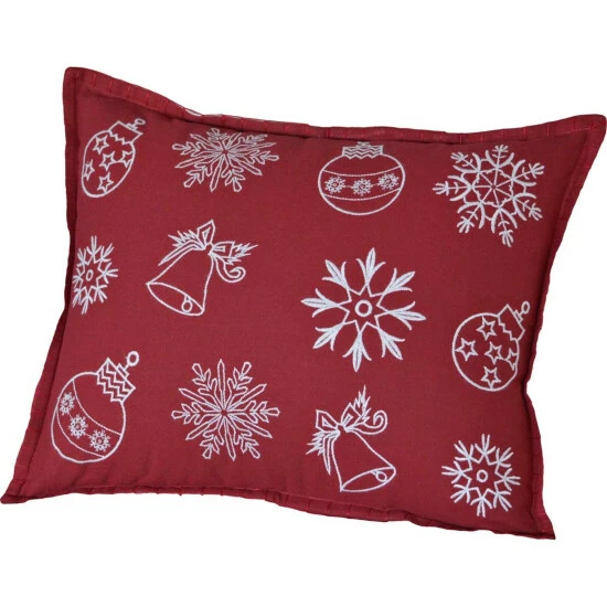 - Crimson cotton casement fabric embroidered with bright white ornament, snowflake, and bell motifs