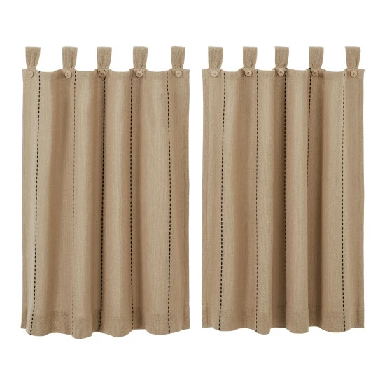 Create warmth in your living space with the Stitched Burlap Tier Set of 2 that has a farmhouse flair and a cozy design. This set of 2 tiers feature natural tan and soft black hues with a straight edge textured dobby weave. Our L36xW36 tiers are finished with a convenient tab top that adds country-style appeal to your kitchen or living room.