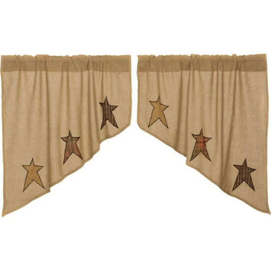 Invite primitive visual appeal to any room with the eye-catching Stratton Burlap Applique Star Swag Set. Β Enjoy whimsical stars in red, orange, and yellow plaids on a tan burlap background. Β Made completely from 100% cotton, our unlined window covers contribute warm, unique design to your living room, dining room, or kitchen as the cozy palette inspires primitive, Americana, log cabin, and farmhouse-themed looks. Β Machine washable and iron-safe, this textured swag set comes with two 36×36 curtains that have rod pockets for convenience.