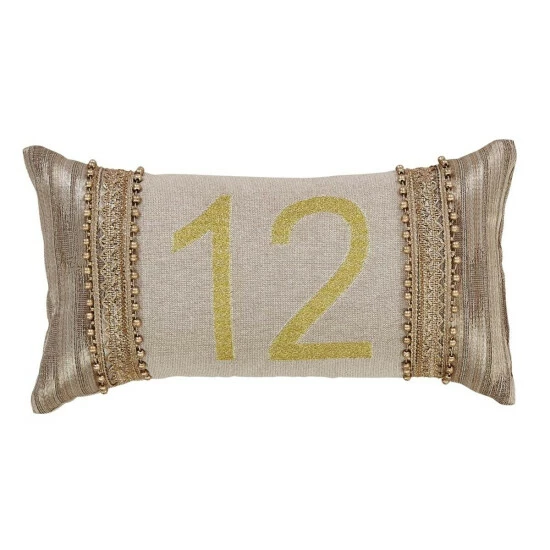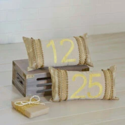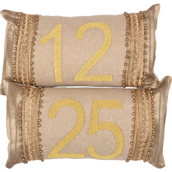 - “12” embroidered on first pillow, “25” embroidered on second pillow, both in shimmery gold thread