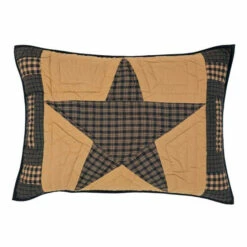- Patchwork block borders in navy and tan accent a 5-point star centered on tan ground