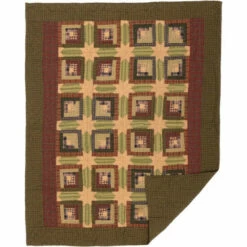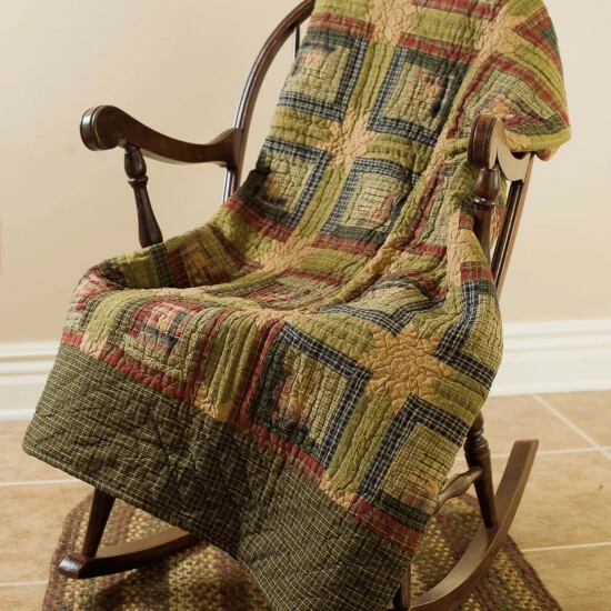 - Log cabin blocks in earthy greens, deep red and warm navy with accent 8-point stars in solid tea stain make this a timeless throw to be passed down with pride
