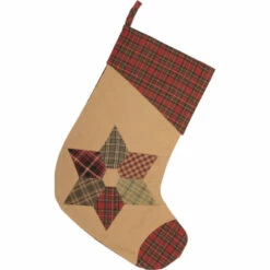 - Dark tan base with 6-point star in various brick red, moss green, and black plaid fabrics