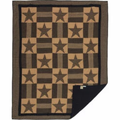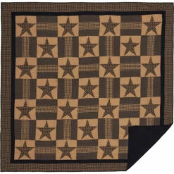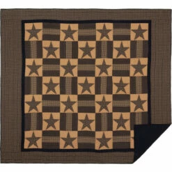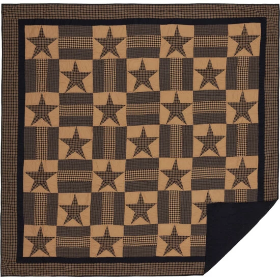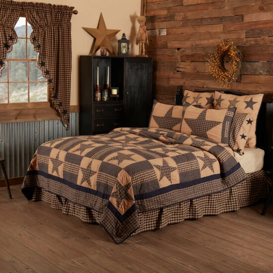 - Traditional 5-point stars alternate with patchwork blocks in navy blue and tan finished with double borders in coordinating fabric