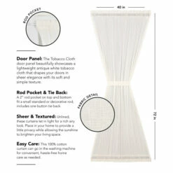 The Tobacco Cloth Antique White Door Panel 72×40 brings a luxuriously upscale farmhouse look to your home or retreat. A lightweight antique white tobacco cloth covers your door in sheer elegance with its soft and simple texture. The rod pocket on this rustic door panel provides simple and easy installment and a secure fit.
